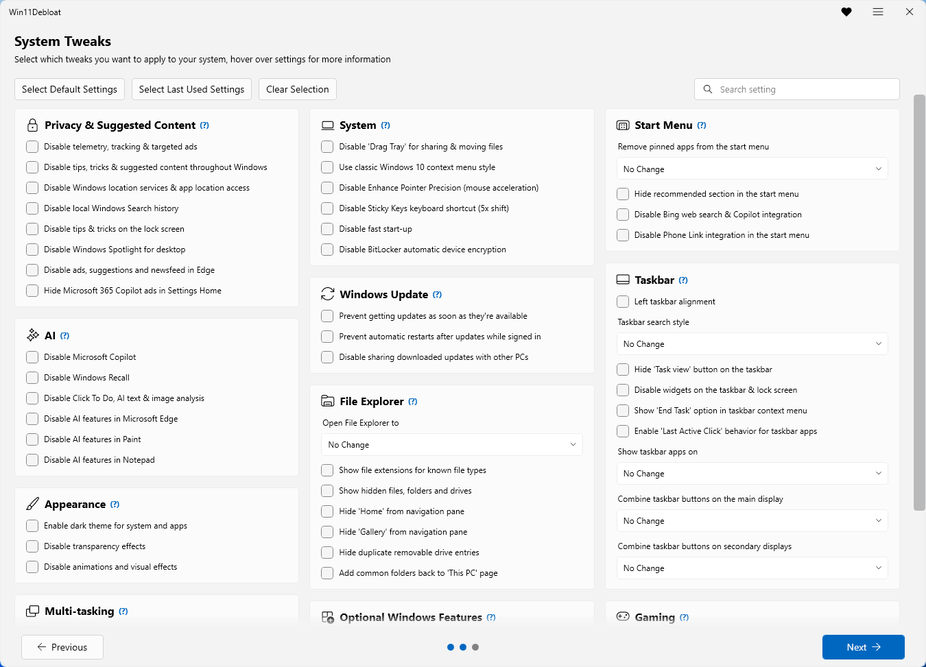 以下は、Win11Debloatが提供する主な機能と機能の概要です。